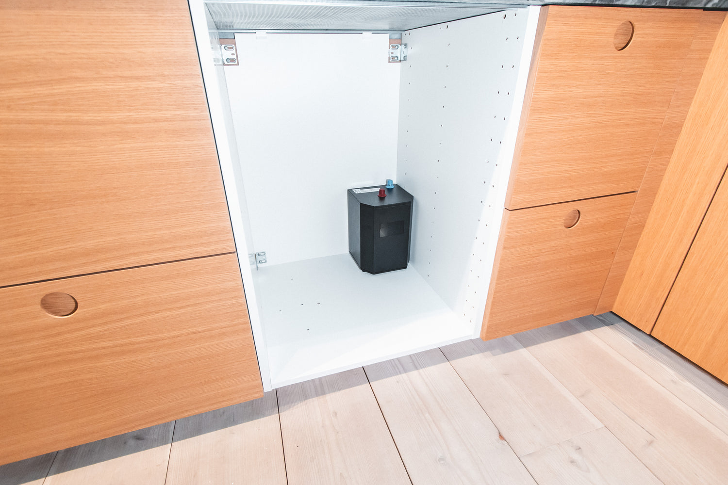 FLOW HEAT fylder omtrent det samme som en lille skotøjsæske og kan derfor nemt stå frit i bunden af skabet, som det kan ses på billedet.