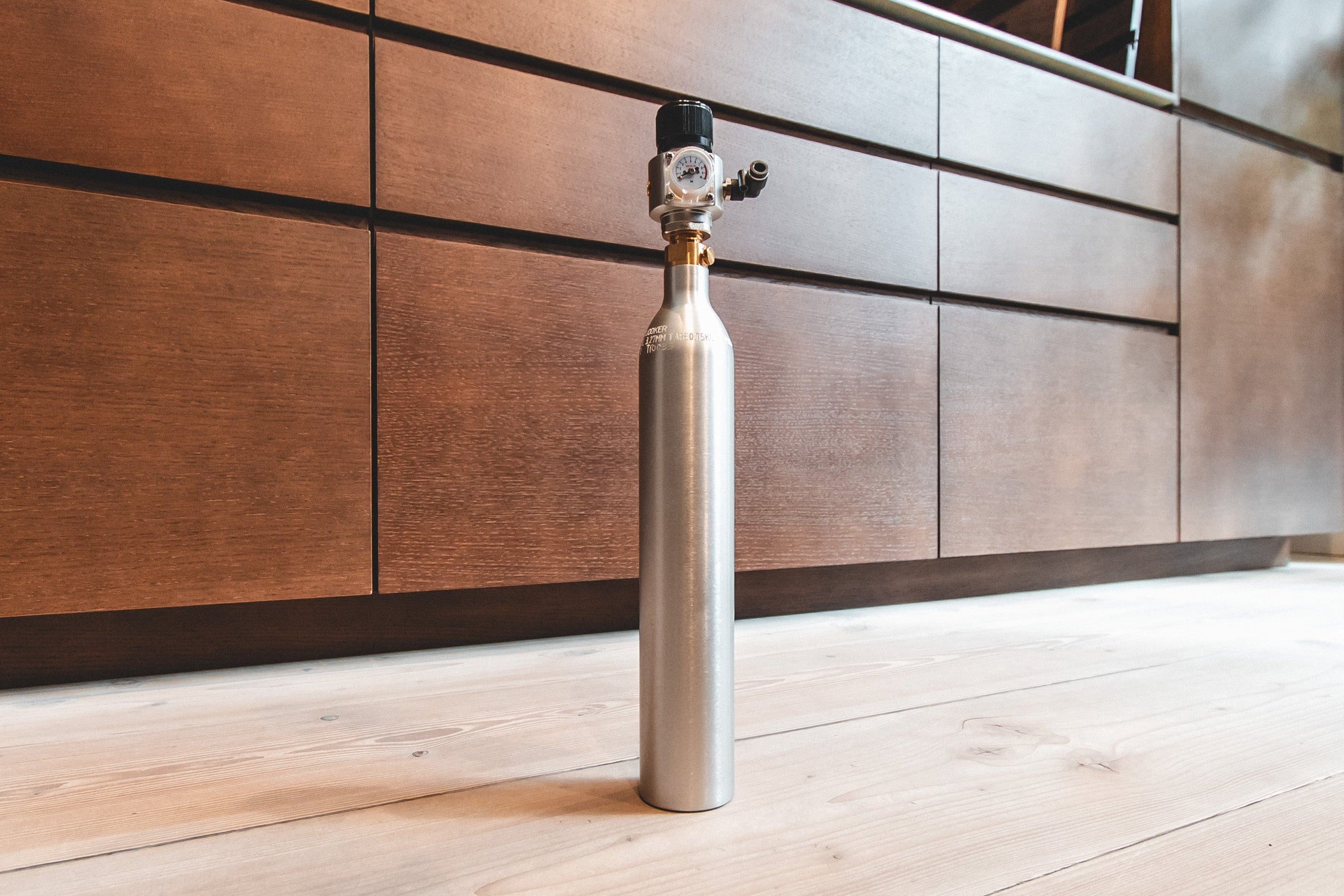 FLOW 5 anvender standard 425 grams CO2 flaske størrelsen. Vi har valgt at anvende denne størrelse fordi den er velkendt og virker.